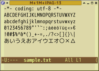 日本語は M+1M+IPAG (size は見やすいように 18pt に変更) で、アスキーの部分を変更してみた。 いずれも Vine Linux 4.2 の Emacs 23.0.94 上でとったもの。